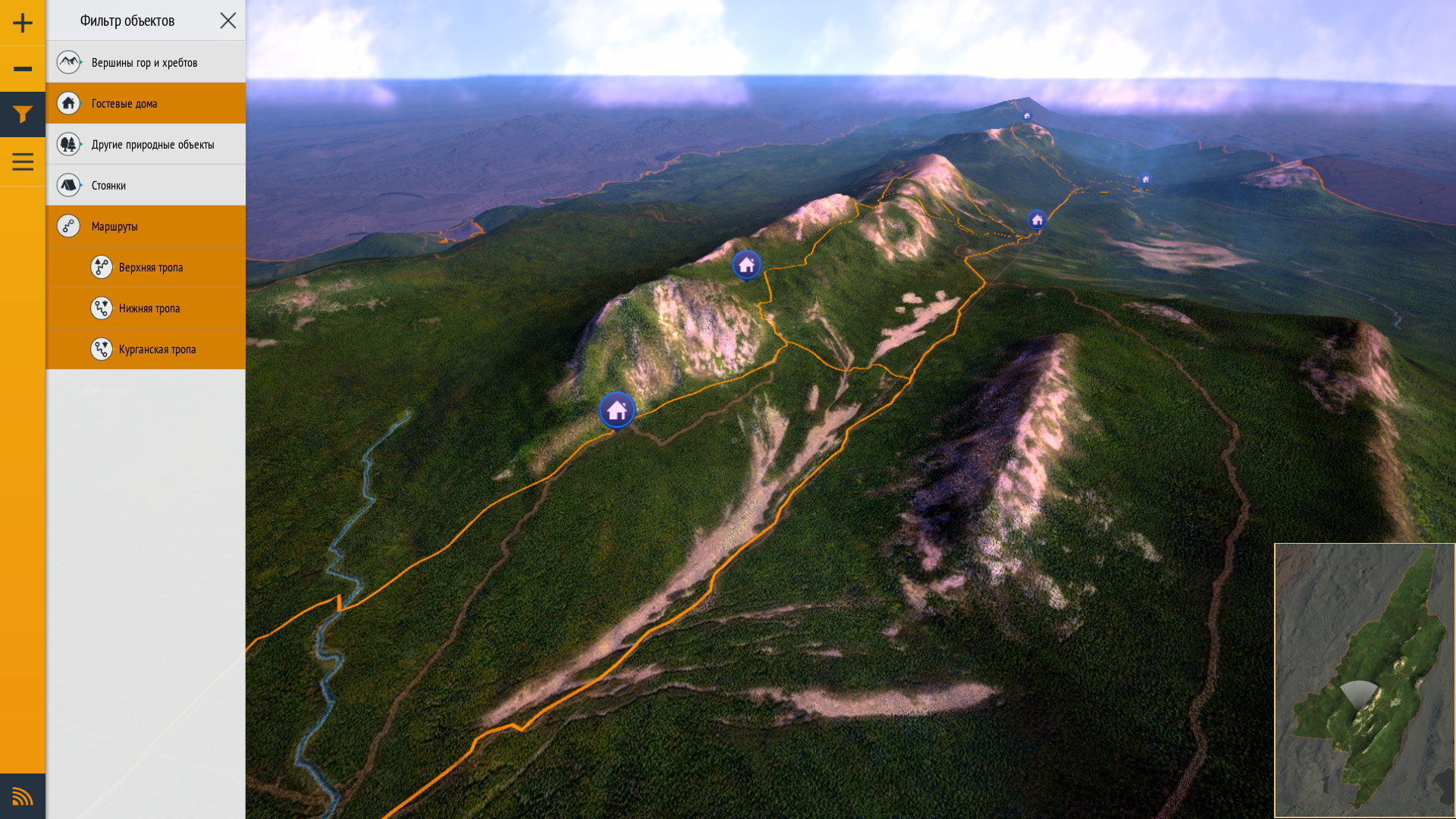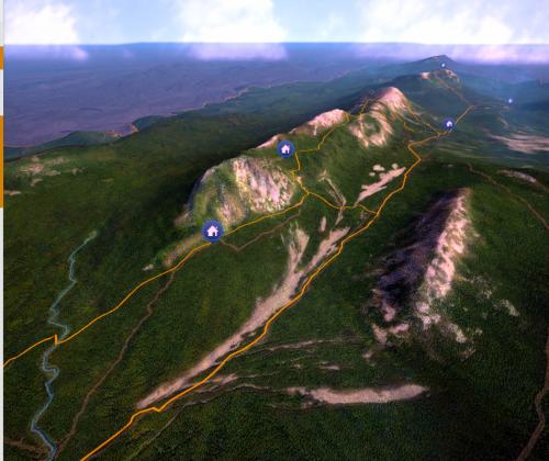 Позволяет ознакомиться с месторасположением: вершин гор, стоянок для отдыха, приютов, проложенных маршрутов. Рекомендуется для установки на мобильные устройства всем потенциальным посетителям.